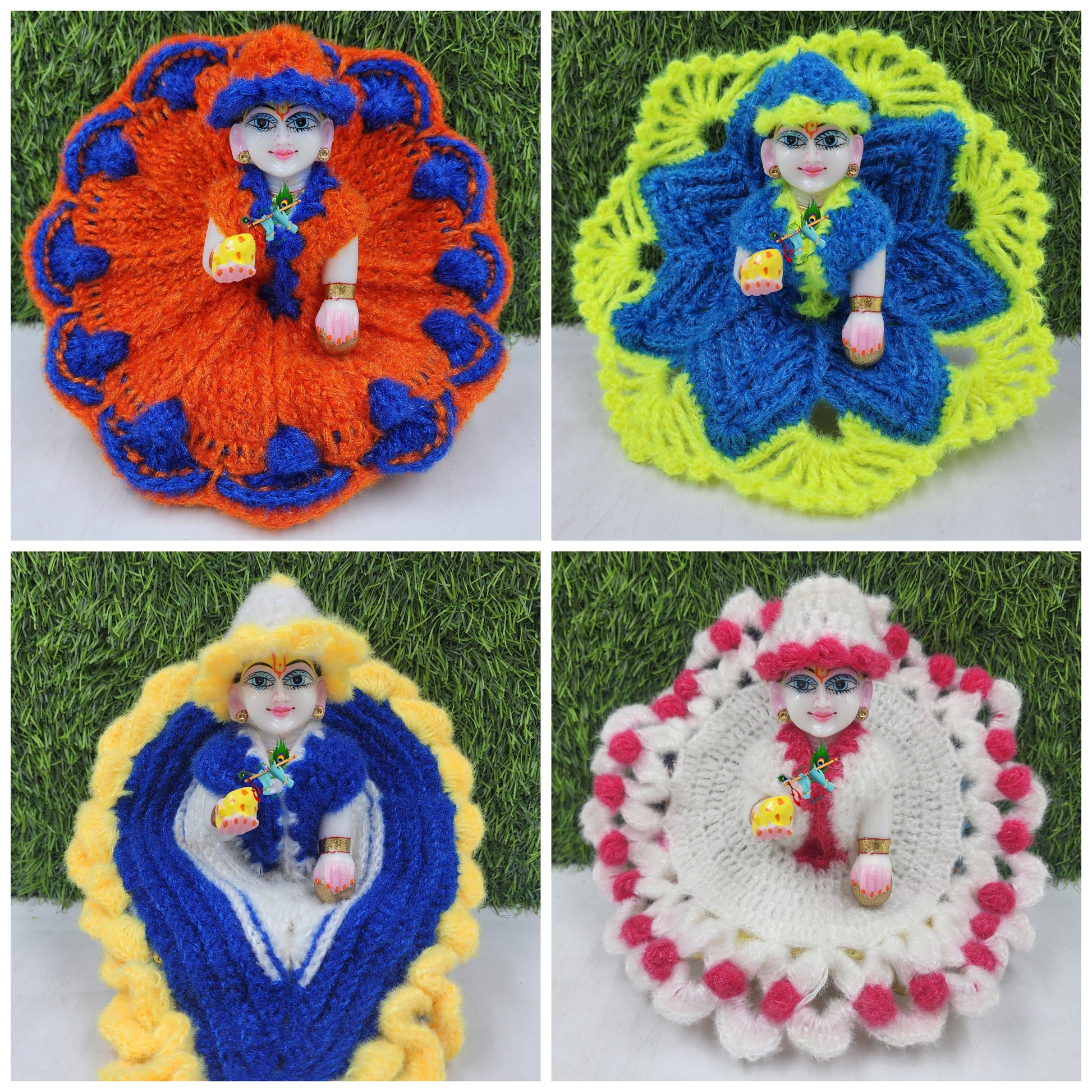 Adorn your beloved Laddu Gopal Ji with our premium Woolen Dress Combo Pack of 4, designed to keep your deity warm during the winter months while adding a touch of elegance. Each dress is crafted from soft, high-quality wool, ensuring comfort and warmth for your Kanha Ji. The combo includes four intricately designed dresses in vibrant colors, perfect for daily puja or festive occasions. Let your Laddu Gopal Ji shine in style and devotion with these beautiful woolen outfits!